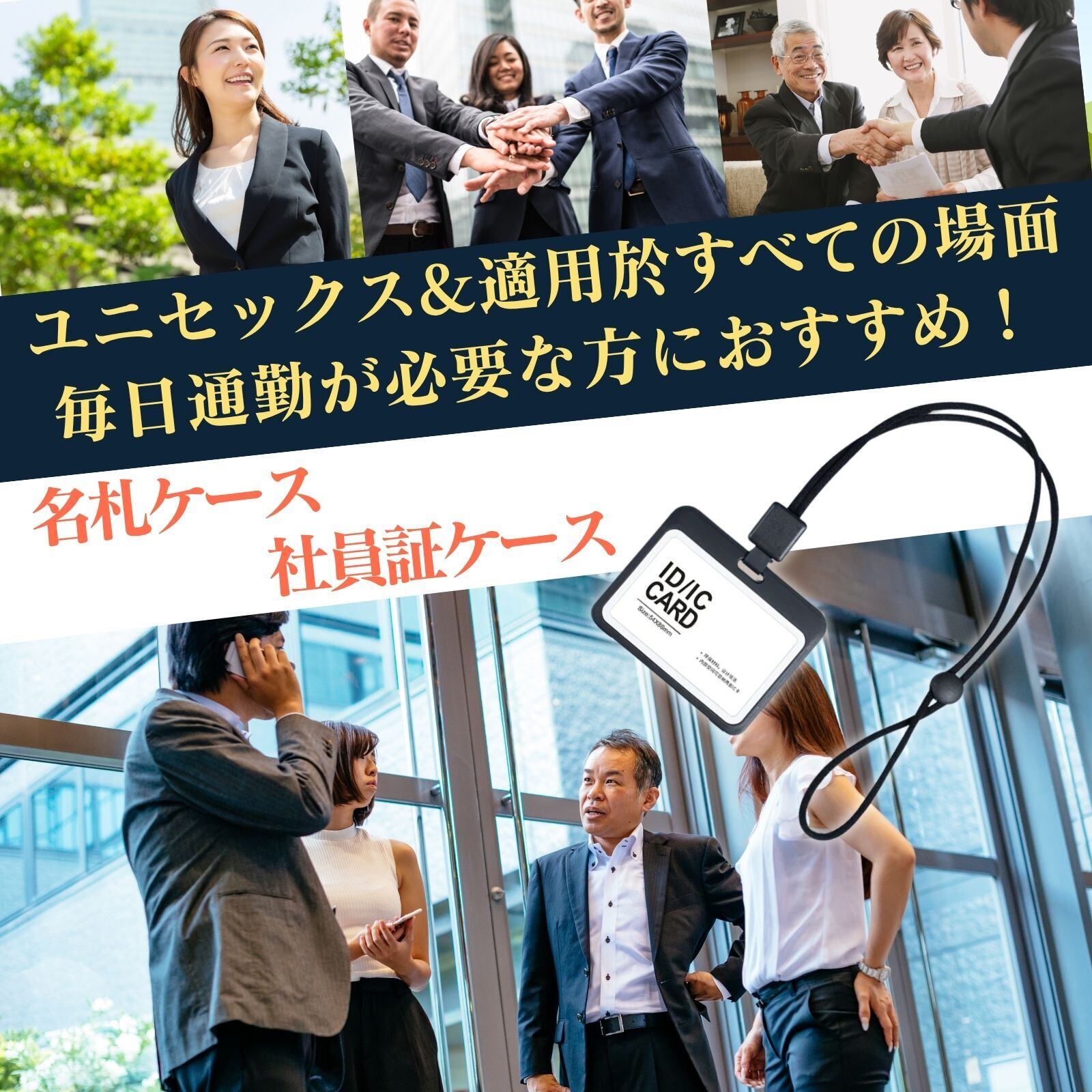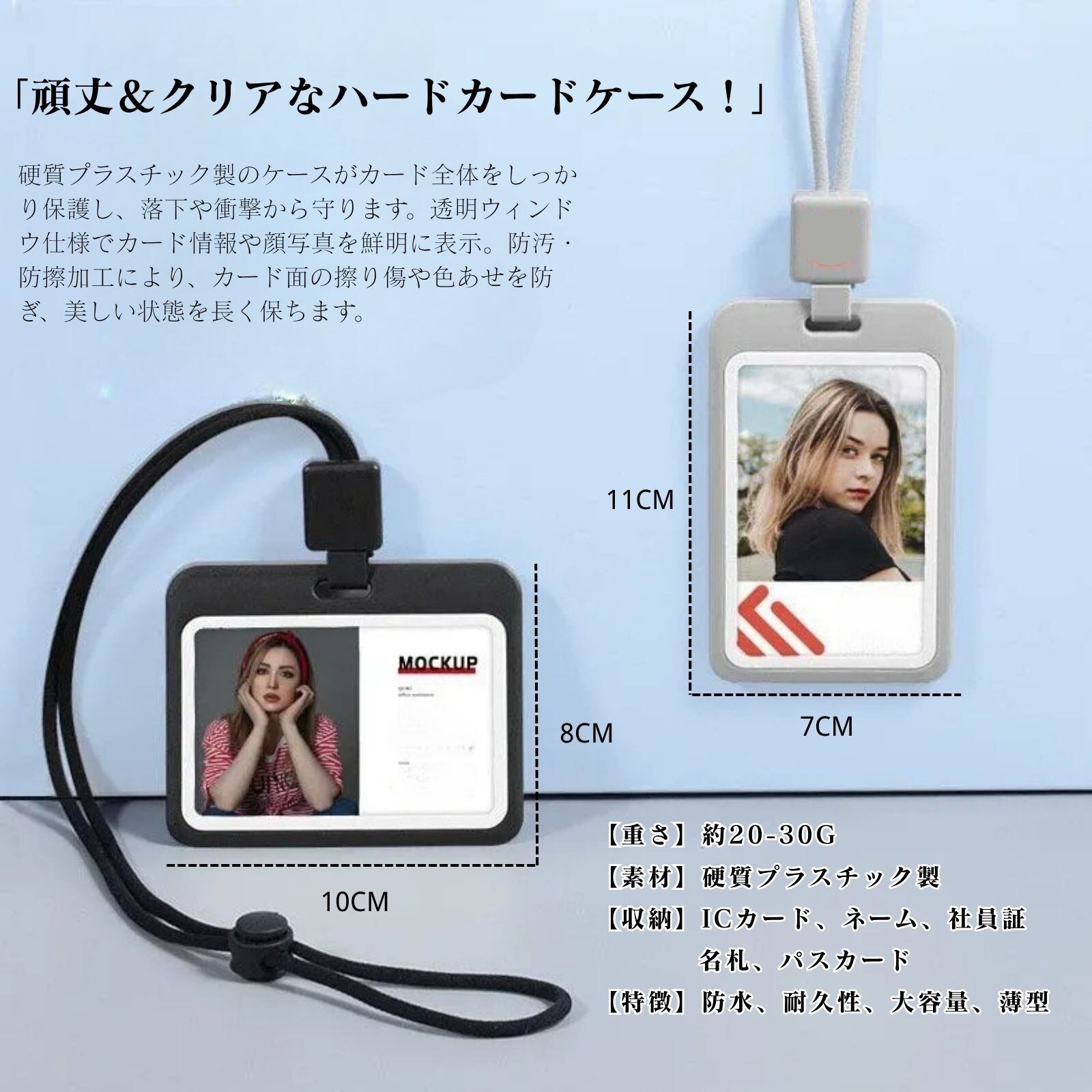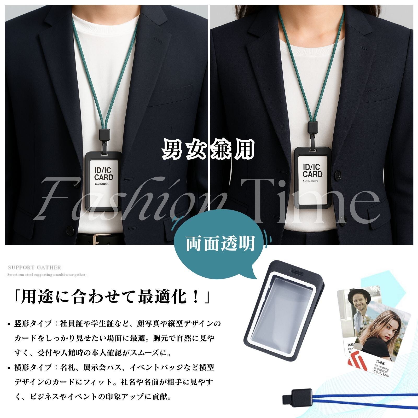 「用途に合わせて最適化!」竖形タイプ:社員証や学生証など、顔写真や縦型デザインのカードをしっかり見せたい場面に最適。胸元で自然に見やすく、受付や入館時の本人確認がスムーズに。横形タイプ:名札、展示会パス、イベントバッジなど横型デザインのカードにフィット。社名や名前が相手に見やすく、ビジネスやイベントの印象アップに貢献。