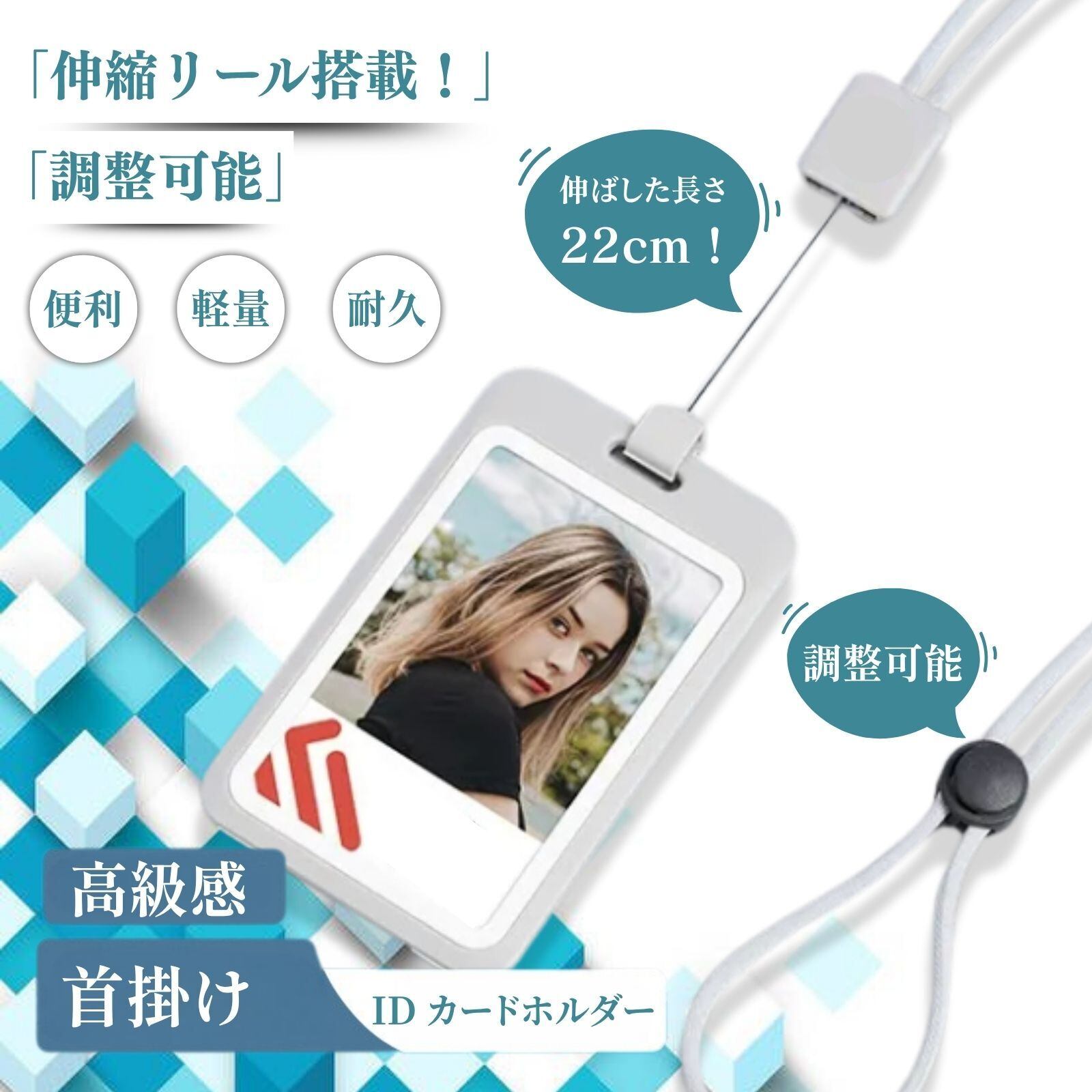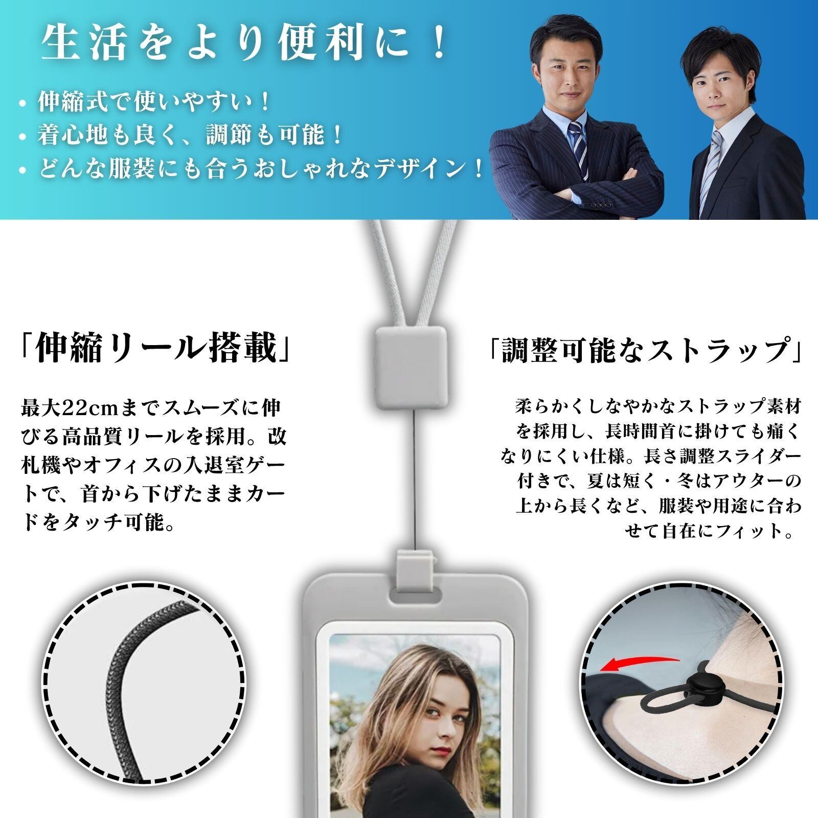 「最長22cm伸縮リール搭載!」竖形・横形ともに、最大22cmまでスムーズに伸びる高品質リールを採用。改札機やオフィスの入退室ゲートで、首から下げたままカードをタッチ可能。伸縮動作は静かでスムーズ、耐久性のあるスチールワイヤー芯で長期間使用しても切れにくく、毎日の通勤・通学やイベント参加に最適です。
