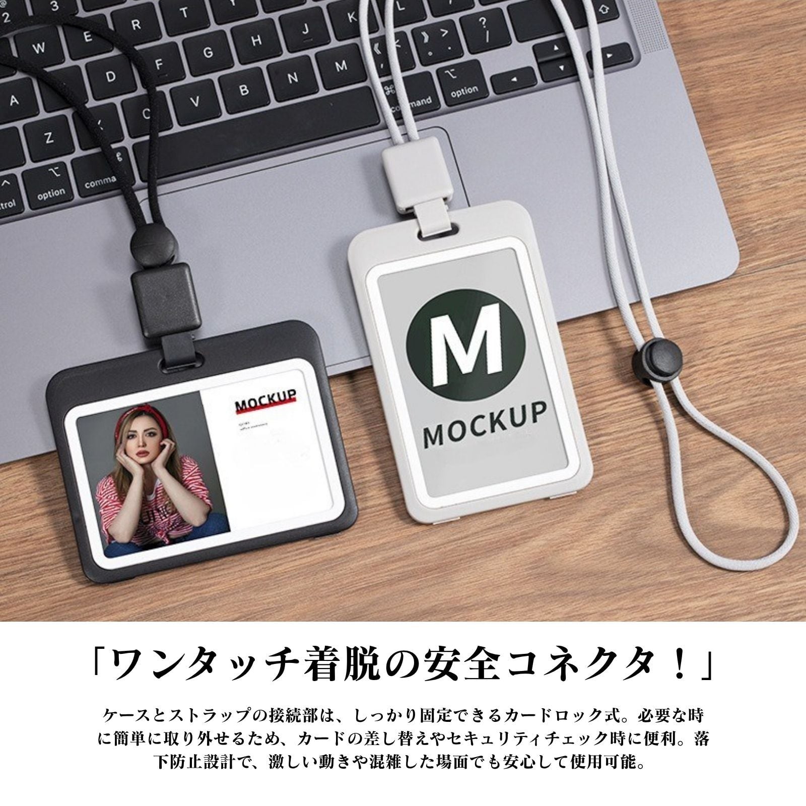 「ワンタッチ着脱の安全コネクタ!」ケースとストラップの接続部は、しっかり固定できるカードロック式。必要な時に簡単に取り外せるため、カードの差し替えやセキュリティチェック時に便利。落下防止設計で、激しい動きや混雑した場面でも安心して使用可能。