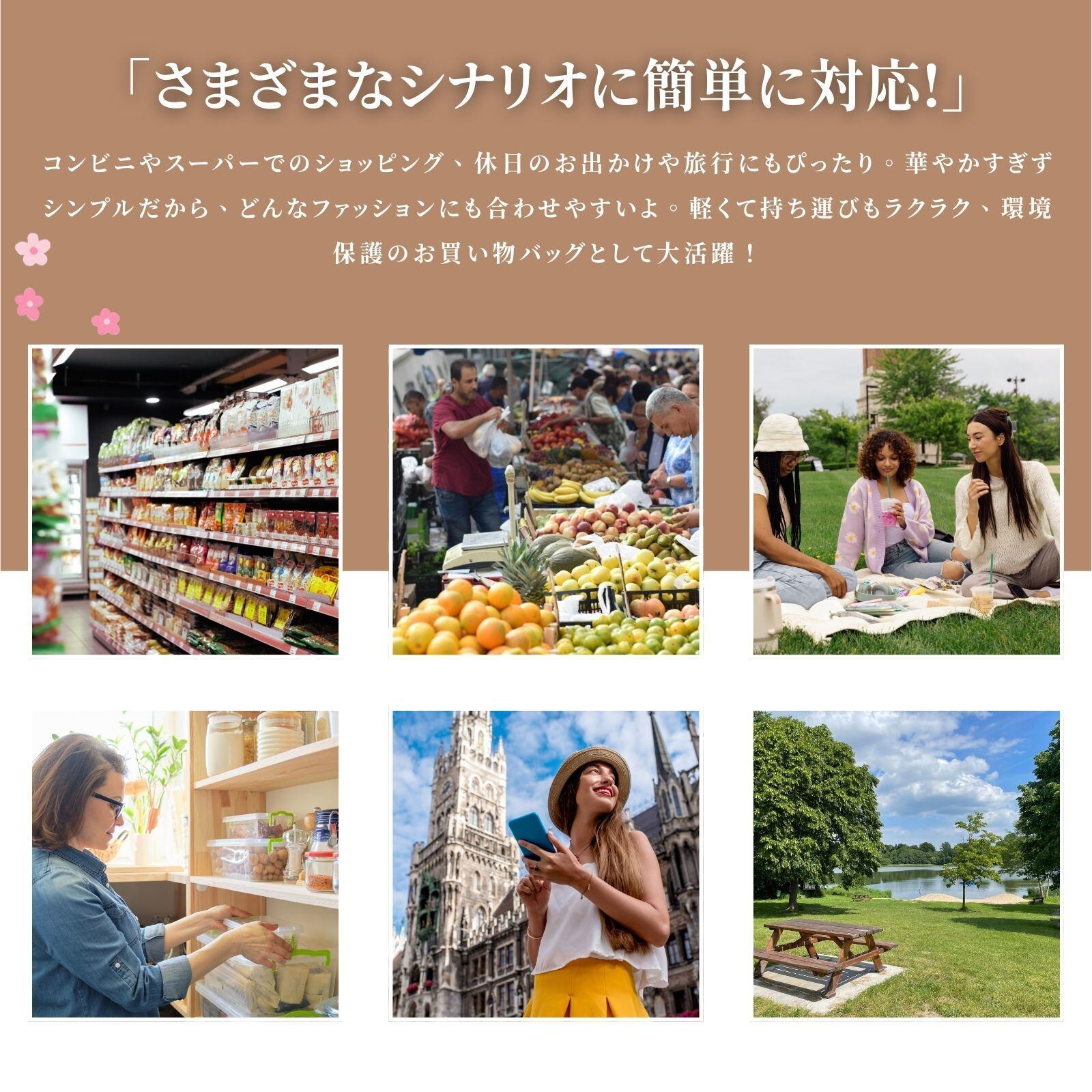 「さまざまなシナリオに簡単に対応!」コンビニやスーパーでのショッピング、休日のお出かけや旅行にもぴったり。華やかすぎずシンプルだから、どんなファッションにも合わせやすいよ。軽くて持ち運びもラクラク、環境保護のお買い物バッグとして大活躍!