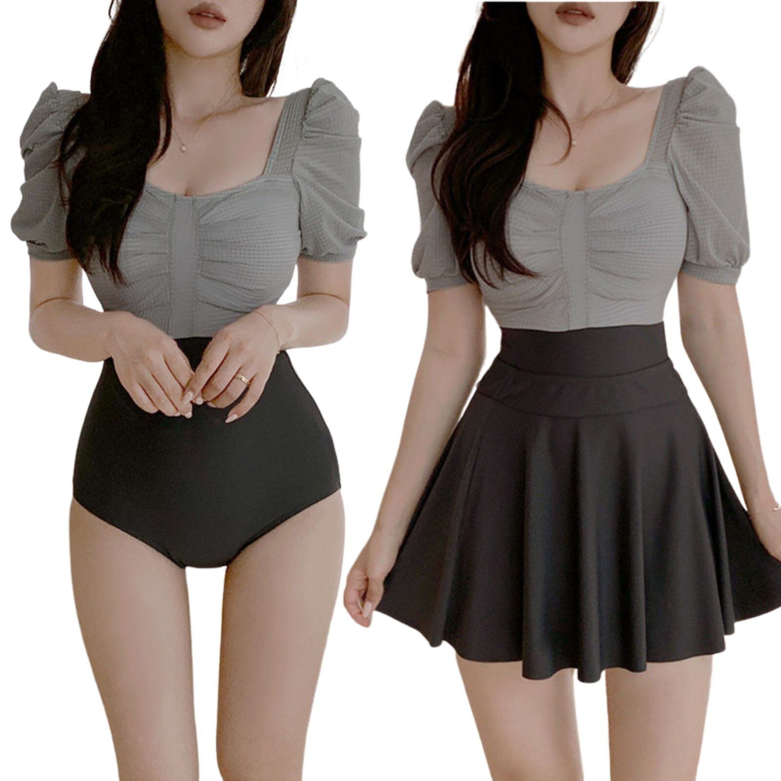 韓国デザインのワンピース水着。バストにも縦に寄せたギャザーデザインで胸元のボリュームUP。ウエストにゆとりを持たせたストレッチデザインで体型カバー力の水着。パフスリーブを可愛らしくなりすぎず上品に着こなせます。