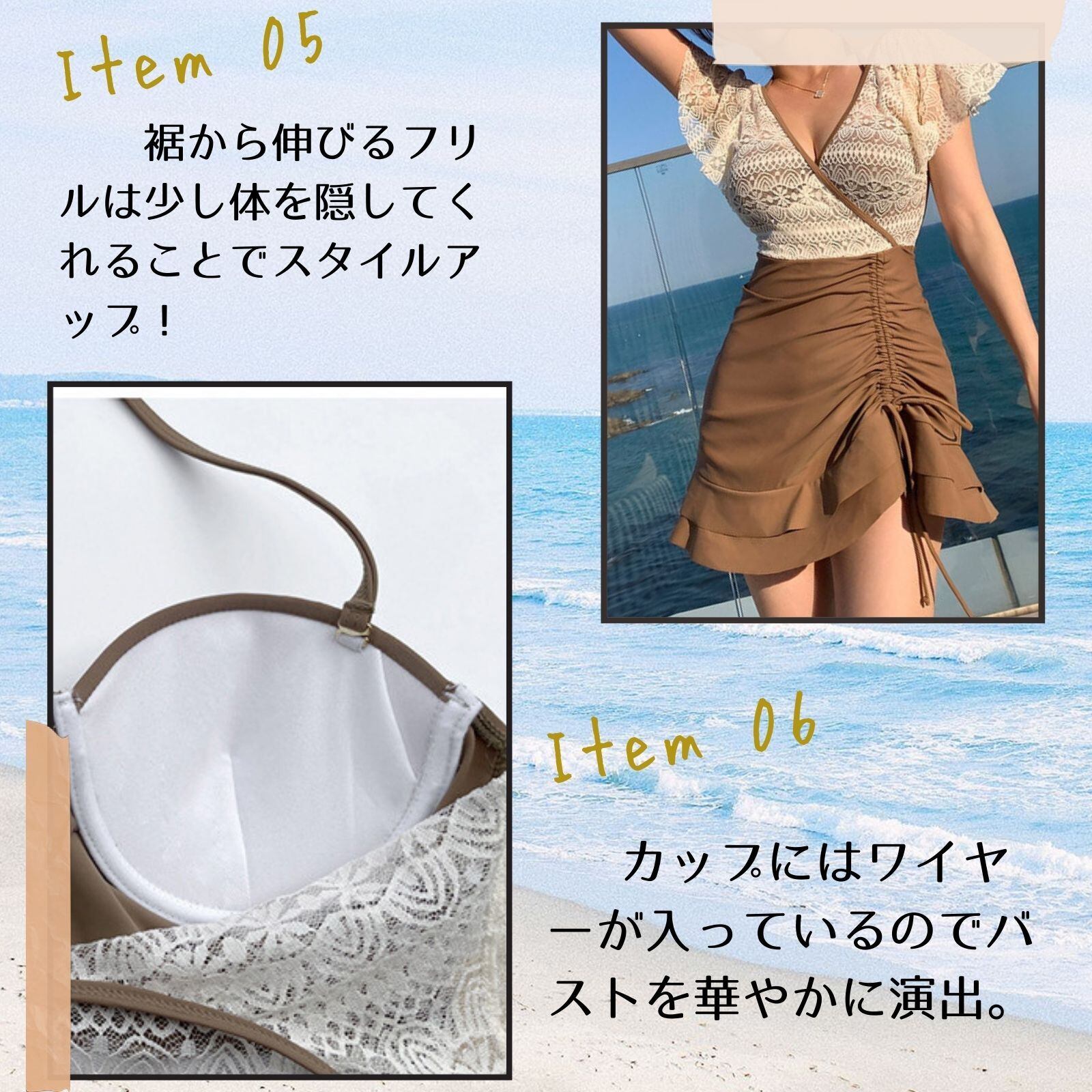 ④「ヘルシーにスタイルアップ」裾から伸びるフリルは少し体を隠してくれることでスタイルアップ!くびれを美しく表現し、ヘルシーで女性らしいスタイルに仕上がります。露出のバランスも絶妙で大人っぽくセクシー!