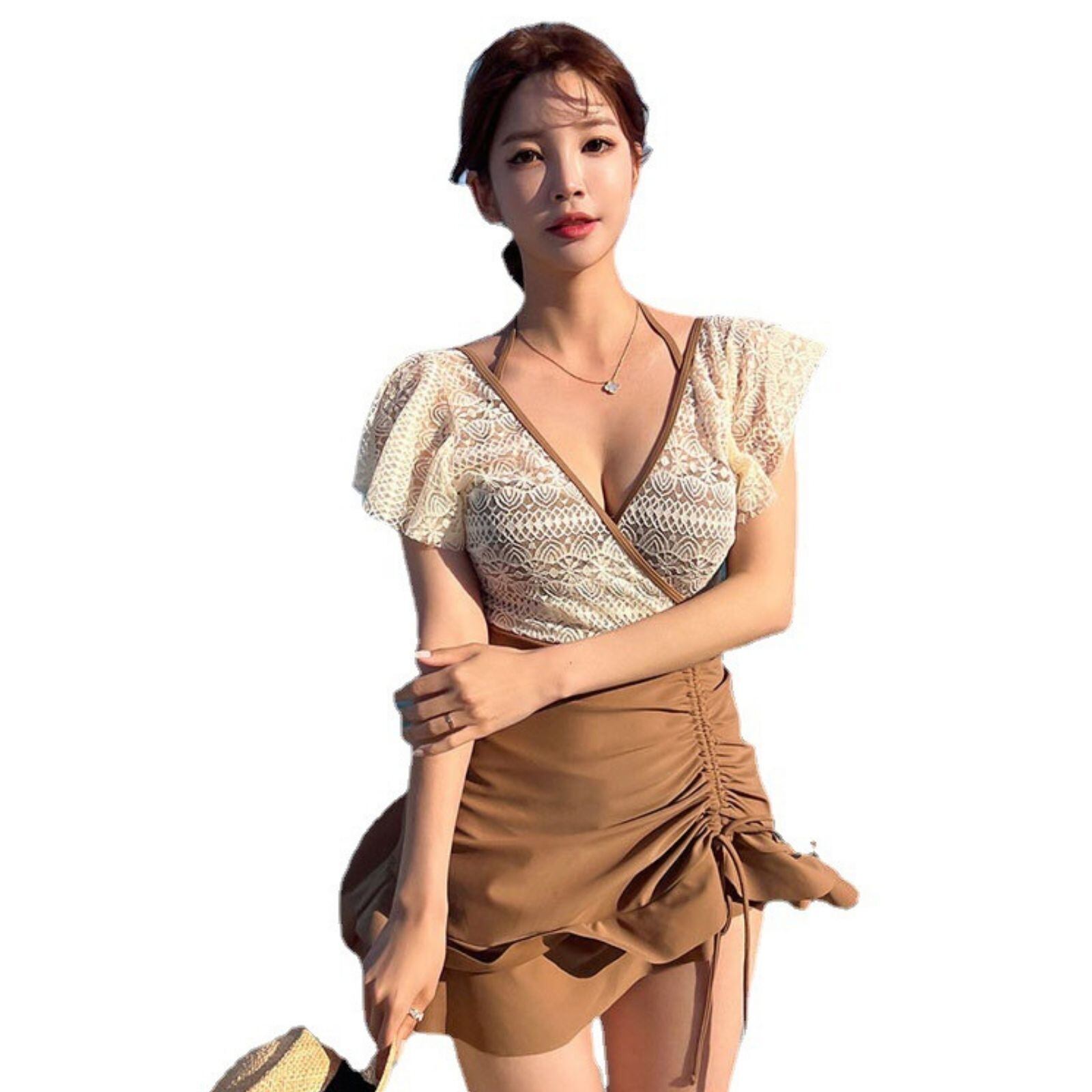 レディース 水着 ワンピース水着 体型カバー オールインワン レース水着 ホルターネック スイムドレス 露出控えめ フリル Vネック 小胸水着 エレガント水着 淡色水着 吸汗速乾 温泉用 海水浴 水泳 スイミング ワイヤー入り ウエスト切り替え2111F#